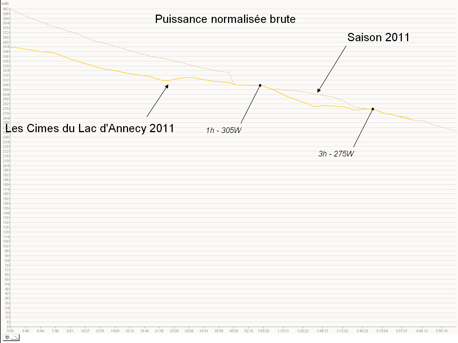 On peut retenir que tu as une sacré aptitude d’endurance critique et maintien de puissance au seuil avec des bests obtenues en fin de saison sur le chrono de Saint Nizier (40min AP315w) et ici sur les Cimes (3H NP275 AP237).